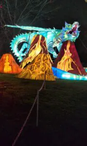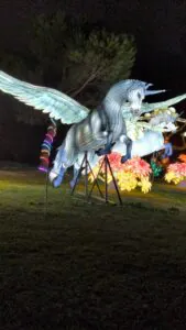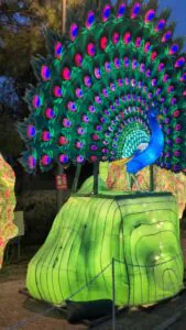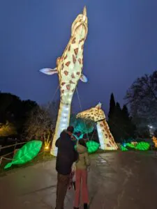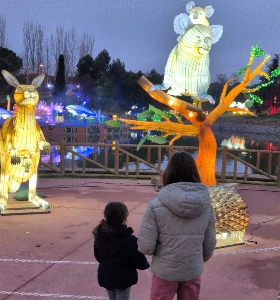 Brilla Zoo es un recorrido iluminado formado por esculturas de animales gigantes, efectos visuales y sonido ambiental que envuelven el entorno natural de los lagos del parque. Las figuras, inspiradas en animales de todo el mundo —desde mamíferos hasta aves exóticas— están repartidas en varias zonas temáticas que hacen que pasear por el parque sea como adentrarse en un zoológico de luz.