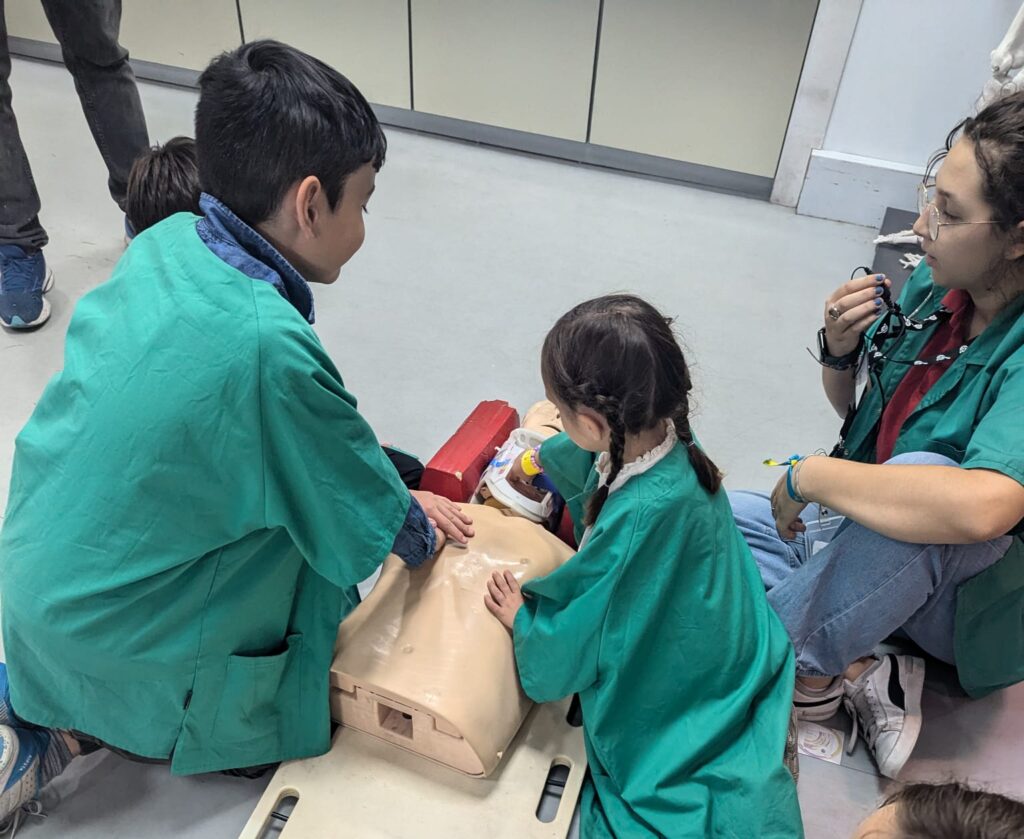 En la imagen, los más pequeños se convierten en médicos y realizan una RCP en el hospital de Micrópolix
